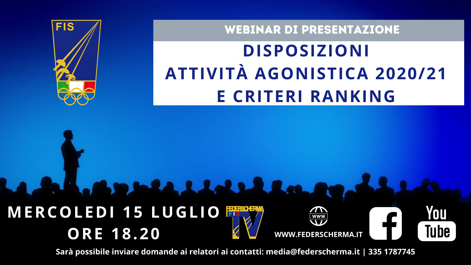 ROMA - Sono state illustrate ieri, mercoledi 15 luglio, nel corso di un webinar, le disposizioni per l'attività agonistica per la stagione "di transizione" 2020-2021 ed i criteri ranking. Al webinar, trasmesso in diretta su FederSchermaTV, hanno partecipato come relatori, oltre al Presidente federale, Giorgio Scarso, anche i componenti il gruppo di lavoro per l'attività agonistica e ranking: dal Consigliere federale referente Renato Buratti, ai membri Nando Fanelli, Leonardo Patti, Eugenio Migliore, Patrizio Panattoni e Cristiano Magnani. A presentare il nuovo percorso della stagione agonistica "di transizione" sono stati anche il Segretario generale, Marco Cannella ed il Responsabile dell'Area tecnico-sportiva, Adriano Bernardini.